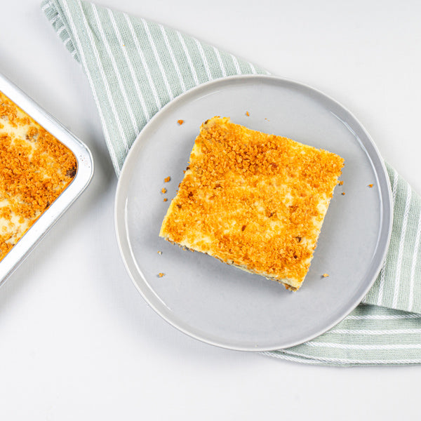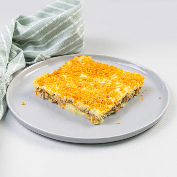 When you’re in the mood for a meaty, savory, homely, comfort food, indulge in our traditional Potato Souffle. This oven-able tray of sautéed seasoned ground beef with vegetables, encased in a creamy buttery mashed potato that the whole family will love!
