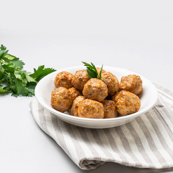 Evenly sized balls of a mixture of ground chicken, spices and seasoning. They are a perfect match for a pasta dish, a casserole, a panini or even a kid sandwich.
