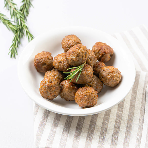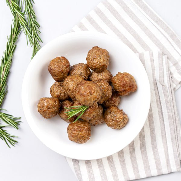 Evenly sized balls of a mixture of ground beef, spices and seasoning. They are a perfect match for a pasta dish, a casserole, a panini or even a kid sandwich.