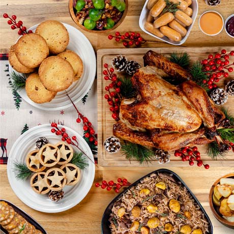 A festive feast featuring succulent turkey, 6 mince pies, and 6 turkey cranberry pies—perfect for the season!