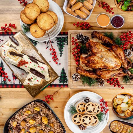 A complete holiday feast with succulent turkey, a decadent Yule log cake, 6 mince pies, and 6 turkey cranberry pies—perfect for celebrating in style!