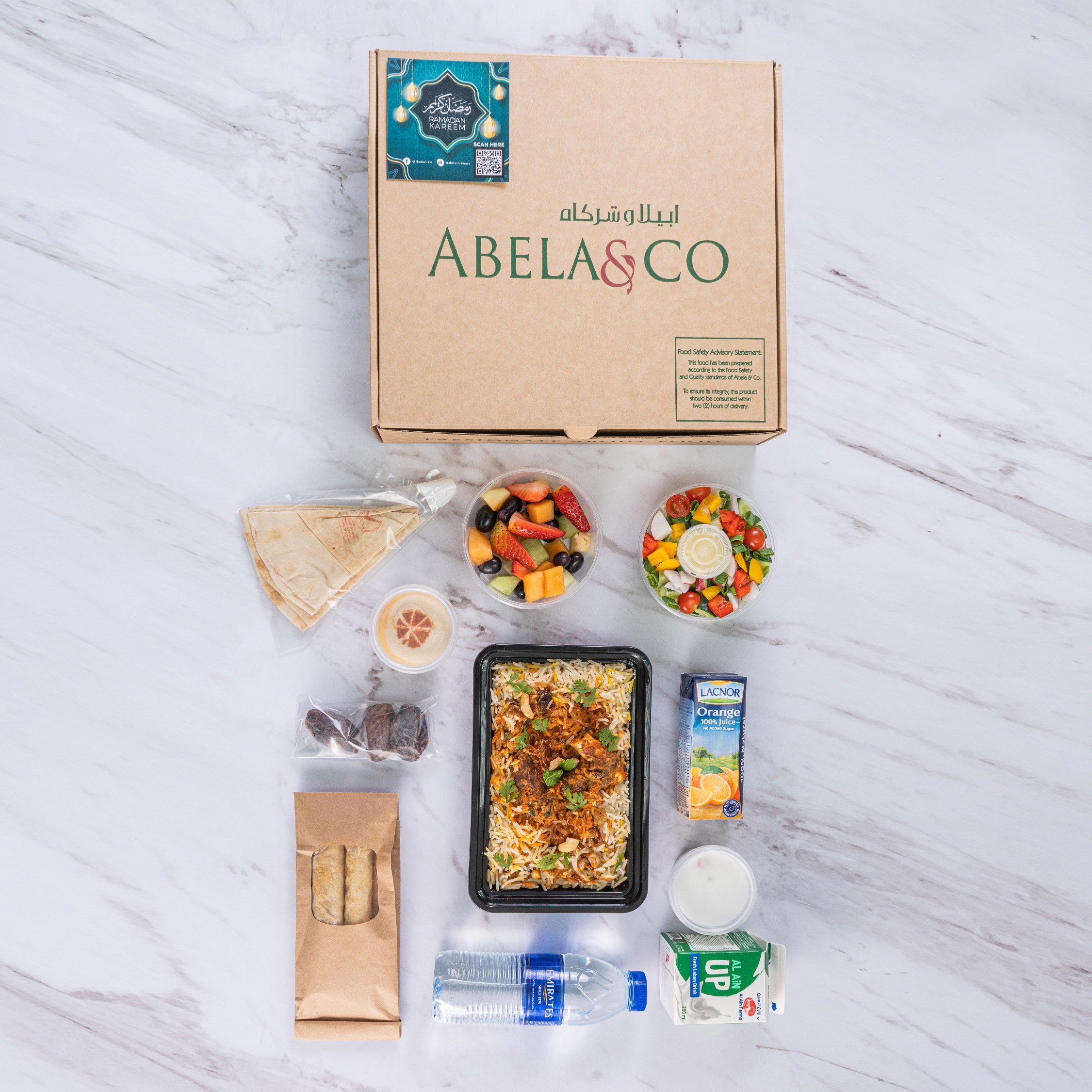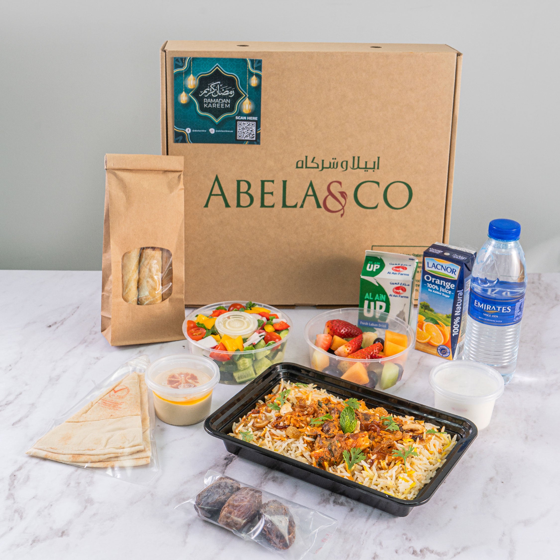 Lamb Biryani is a rich, aromatic dish made with tender lamb, basmati rice, and a blend of spices served with raita. The box contains main course, dates, Arabic snacks, salad, fruit salad, hummus and bread, juice, laban up and water.
